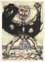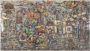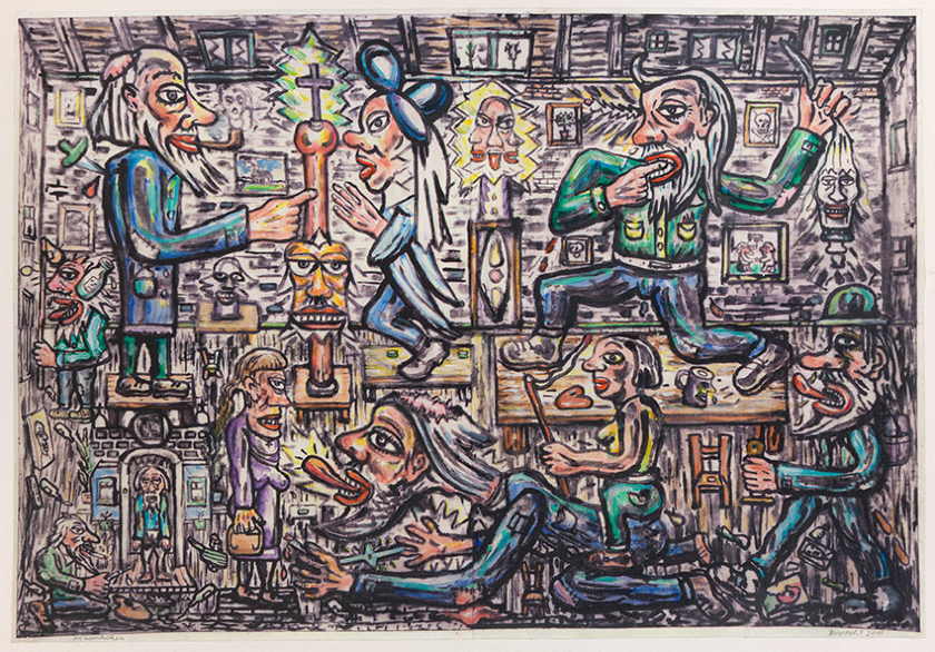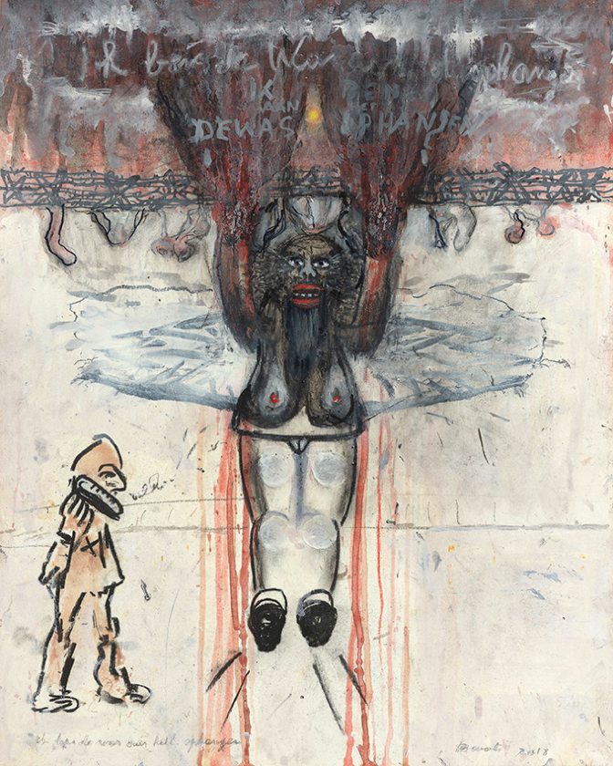“Ook zijn recente werk is monumentaal en door de band muurvullend. Maar die wall-power geldt evenzeer voor zijn kleinere composities, met hun grafisch kluwen dat de kijker opzuigt in een labyrint van beelden en tekens. Het zijn werelden vol verhalen en anekdotes die zich laten lezen in de expressie van een samengebald beeld dat een en al uiting is van angst, koleire, tederheid en theater. Vaak gelijktijdig doodernstig en vol humor, vaak zelfspot.”