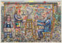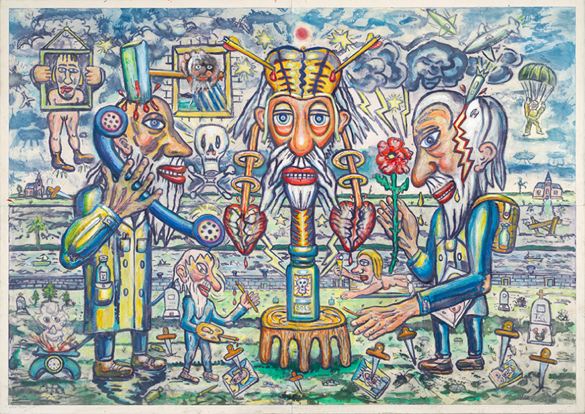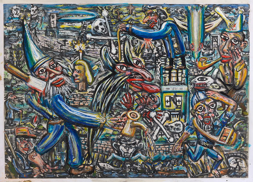 En er zijn natuurlijk de talrijke zelfportretten, atelierbeelden en familietaferelen. ‘Sara, Lutgart, ik’ (2020) toont zijn echtgenote Lutgart die zijn kop sculpteert, Sara die tekent en Fred voor de schildersezel. De geboorte van zijn kleinzoon Ferre staat centraal in tal van werken, zoals o.m. ‘Drie Koningen’ (2021), waar drie eerder louche figuren opduiken met maskers (een referentie naar mondmaskers?).