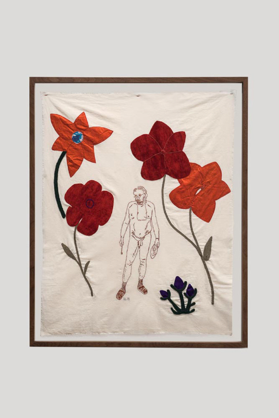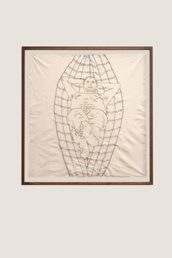 ‘Vrienden, kennissen of volstrekt vreemden: al deze mannen poseren naakt voor Agnès Guillaume, die van hen het onderwerp maakt van haar groot borduurwerk, uitgevoerd op een katoenen canvas. De achteraf toegevoegde accessoires en decoratieve elementen geven de zeer realistische portretten een droomachtige, ongebruikelijke dimensie. De reeks stelt ook een cliché in vraag: de associatie tussen textiel en vrouwelijkheid. Hangt mannelijkheid slechts aan een zijden draadje?’, aldus Pierre-Yves Desaive, curator voor Hedendaagse Kunst in de Koninklijke Musea voor Schone Kunsten van België.